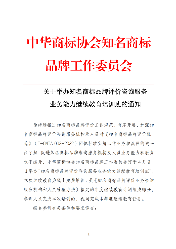 365体育投注_nba比分直播-【唯一授权牌照】@:举办知名商标品牌评价咨询服务业务能力继续教育培训班的通知