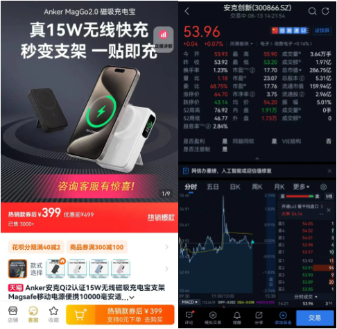 该事件在网络上持续发酵,卖家们迅速捕捉商机,将这款充电宝冠以“懂王同款/川普认证”的标签。除了产品爆火之外, ANKER创新A股股票也开始涨停,充分体现了特朗普的“带货”能力。