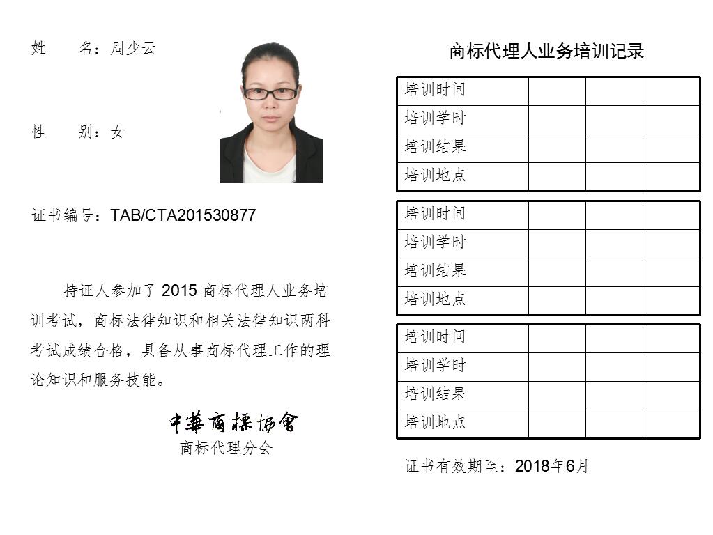 首页 > 代理分会 > 合格证书查询 > 2015年商标代理人业务培训考试合格证书 > 两科合格人员名单 > 厦门祥珑知识产权有限公司