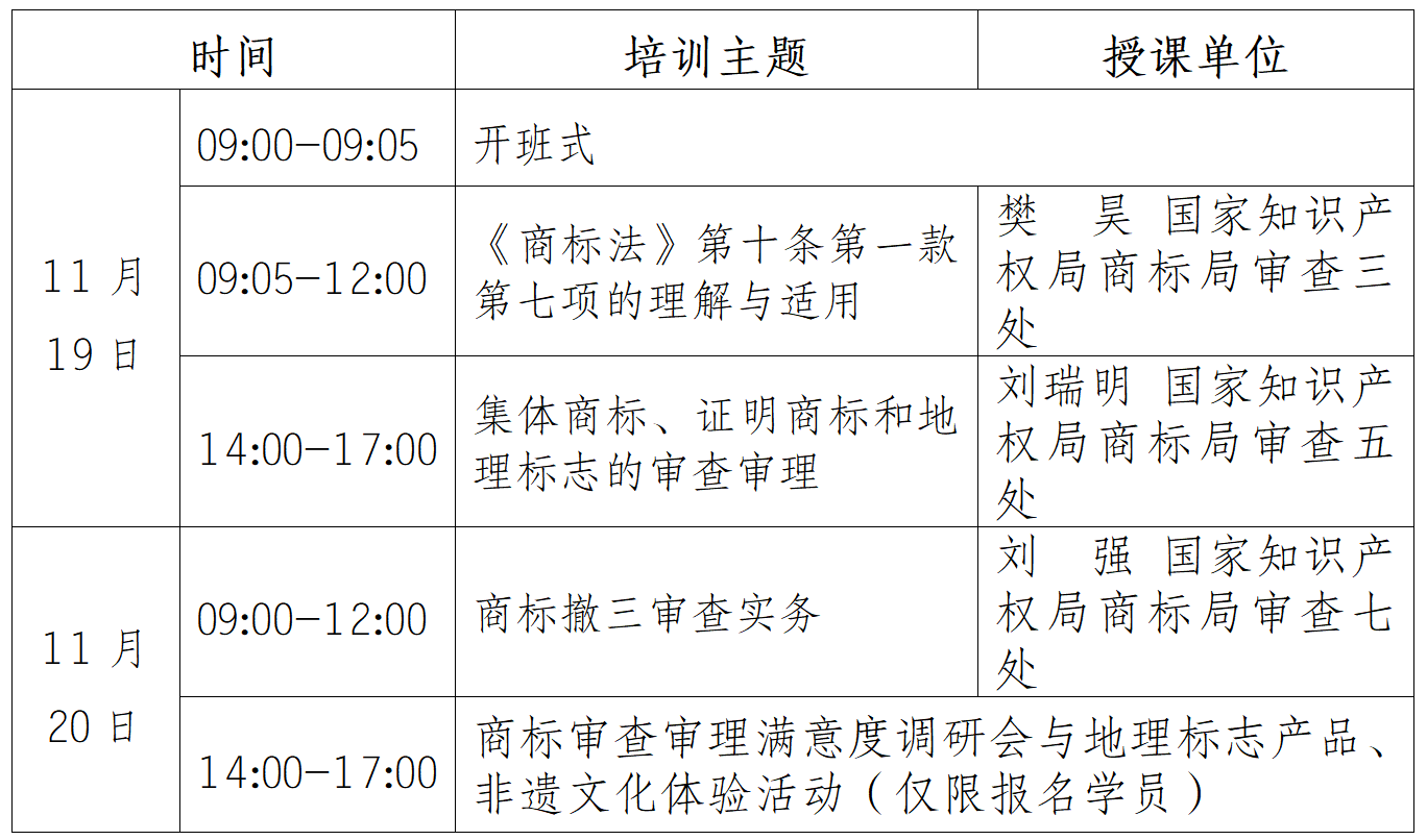 为维护商标注册管理秩序,促进商标审查审理提质增效,国家知识产权局进一步完善商标审查审理工作机制,重点对商标撤三审查制度、带有欺骗性商标禁用审查制度以及地理标志商标审查制度等进行优化升级。为帮助会员了解商标审查审理工作最新动向,准确把握商标审查审理标准,规范商标注册申请行为,进而助力提升商标注册效率与质量,365体育投注_nba比分直播-【唯一授权牌照】@定于11月19-20日在江苏南京举办“商标审查审理实务最新动态”培训与交流活动。本次活动由南京市知识产权局、南京市知识产权保护中心协办,南京天一商标事务所有限公司、南京优注宝信息科技有限公司承办。活动相关安排如下: